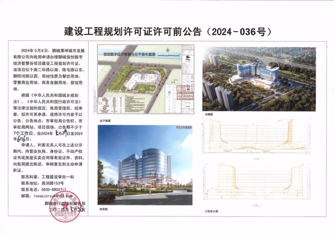 2024年5月6日,聊城厚坤城市发展有限公司向我局申请办理聊城信创数字经济智慧谷项目建设工程规划许可证,该项目位于南二环路以南、陈屯路以东聊阳河路以西,用地性质为餐饮用地、零售商业用地、商务金融用地、旅馆用地。 根据《中华人民共和国城乡规划法》、《中华人民共和国行政许可法》等法律法规的规定,我局受理后,经审查,拟许可其申请,现将许可内容予以公告。公告地点:市审批局公告栏、市审批局网站、项目现场。公告期不少于7个工作日,自2024年5月29日至2024年6月6日。 申请人、利害关系人可在上述公示期内,持营业执照、身份证、不动产权证书或房屋买卖合同等有效证件、资料向我局提出陈述、申辩意见和主动申请听证。 联系科室:工程建设审批一科 联系地址:昌润路153号 联系电话:0635-8903717 邮箱:lcsspjzrzyk@163.com 聊城市行政审批服务局 2024年5月28日