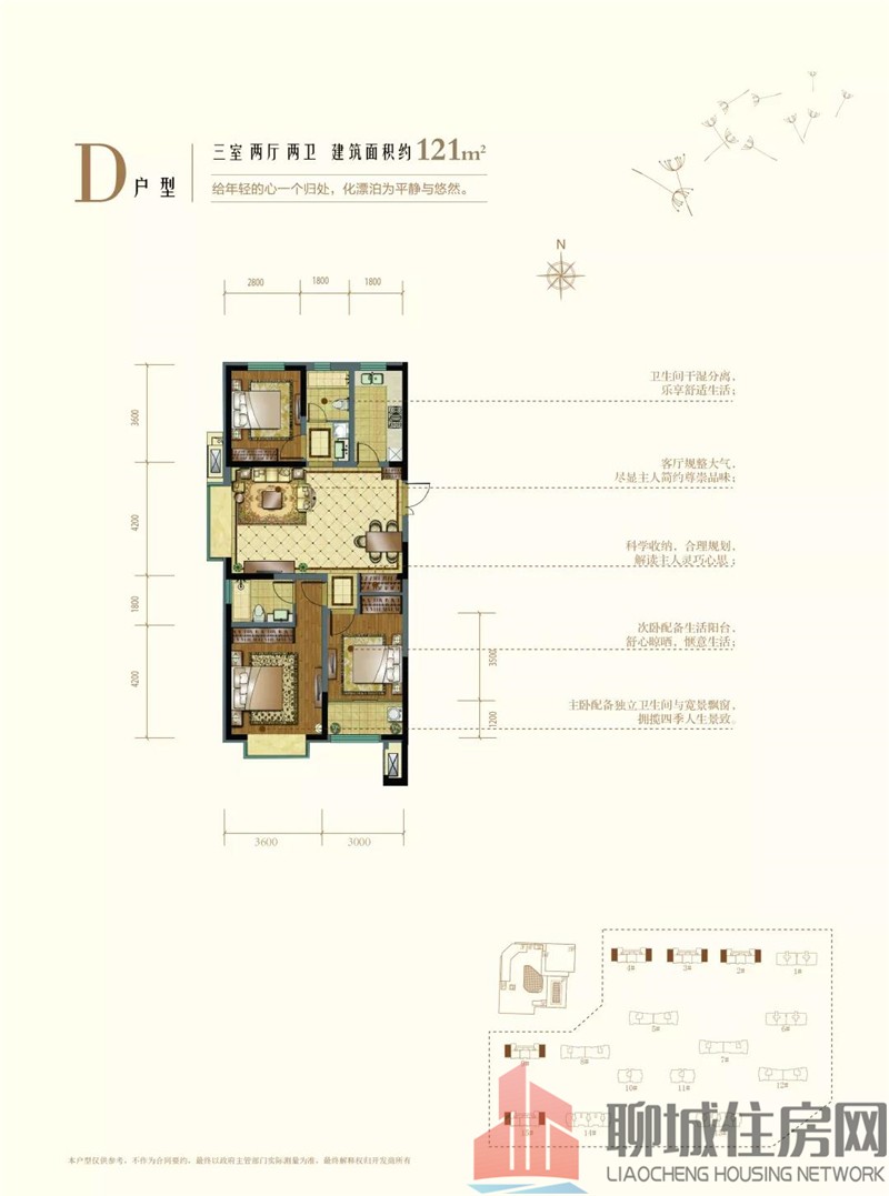 卫生间干湿分离,乐享舒适生活 客厅规整大气,尽显主人简约尊崇品味 科学收纳,合理规划,解读主人灵巧心思 次卧配备生活阳台,舒心晾晒,惬意生活 主卧配备独立卫生间与宽景飘窗,拥揽四季人生景致