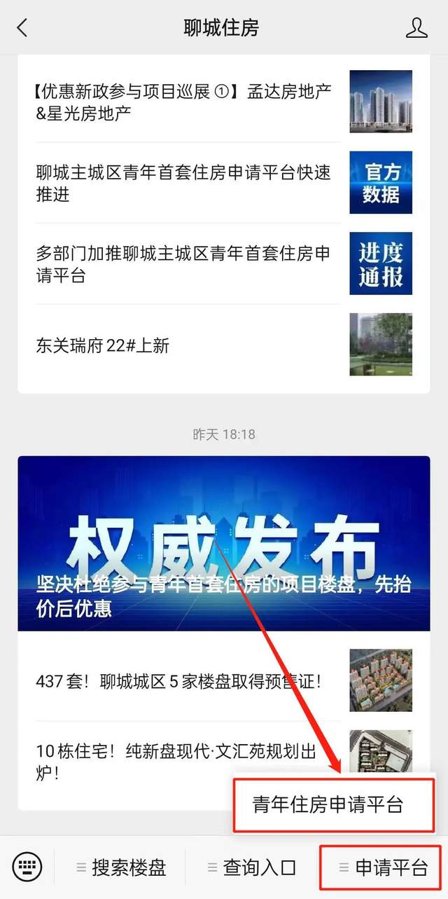 ①打开“聊城住房”公众号菜单栏,点击右下角“申请平台”-“青年住房申请平台”。