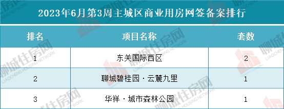 商业用房方面,共有3个项目进行网签备案。数量最多的为东关国际西区,共2套;其次为聊城碧桂园·云麓九里、华祥·城市森林公园网签备案套数均为1套。