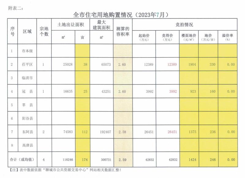 7月份,当期成交4宗,面积174亩,均价246万元/亩,平均溢价率0.00%,规划最大建筑面积30.07 万m² , 平均楼面地价1424元/m² 。其中,主城区当期未有购置。