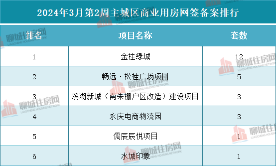据住房网不完全统计,2024年3月第2周(2024.3.11-2024.3.17)聊城市主城区商品房网签备案数据共计163套!其中,住宅用房共63套,商业用房25套,办公5套,其他(车位、储藏室等其它房屋)为70套。