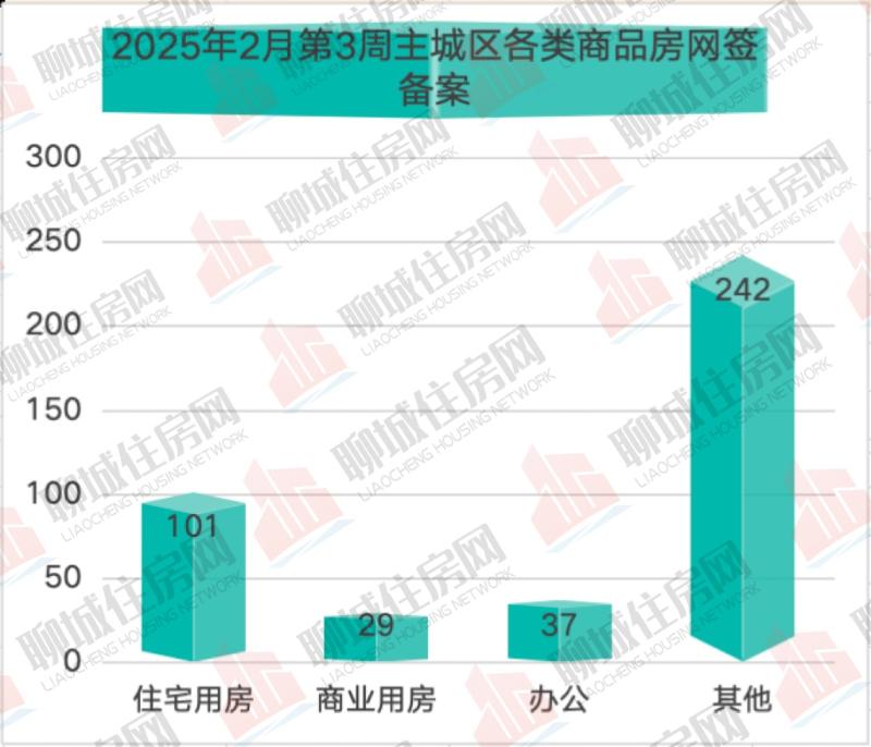 据住房网不完全统计,2025年2月第3周(2025.2.17-2024.2.21)聊城市主城区商品房网签备案数据共计409套!其中,住宅用房共101套,商业用房29套,办公37套,其他(车位、储藏室等其它房屋)为242套。