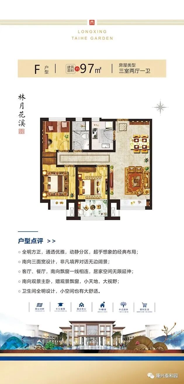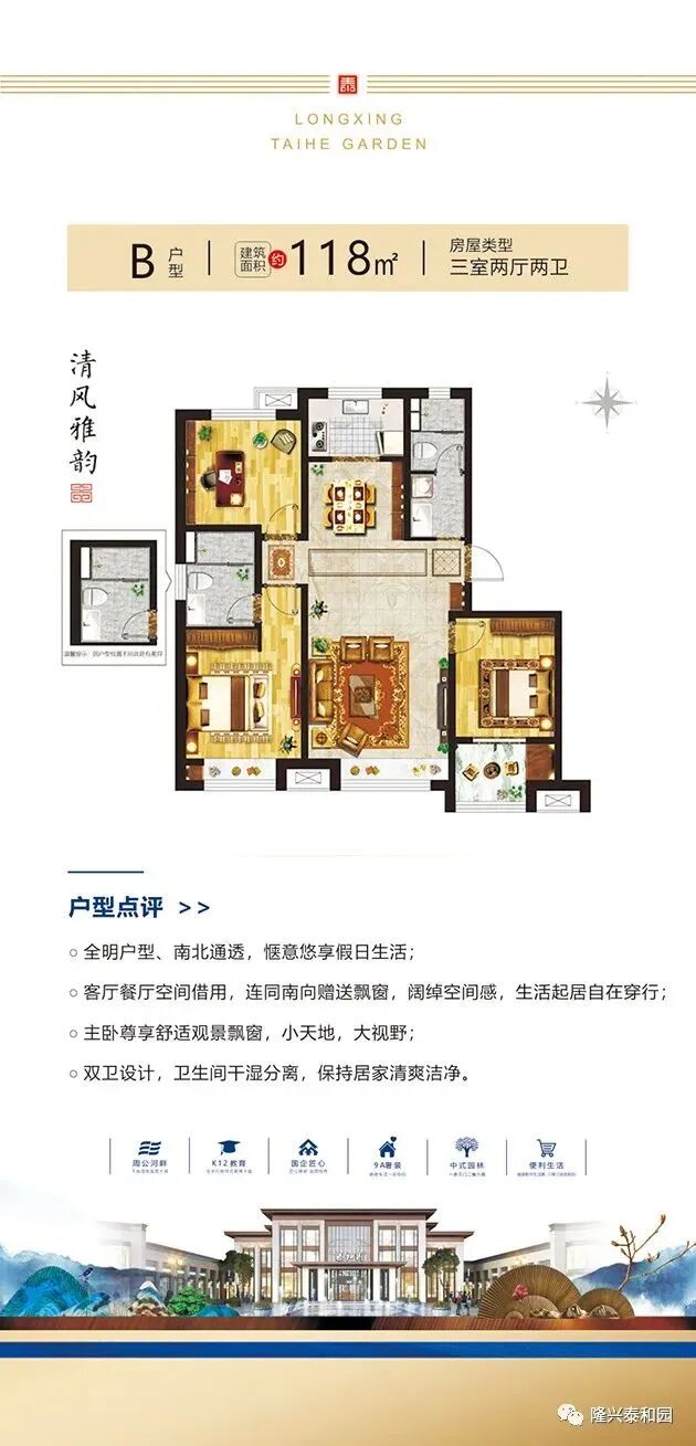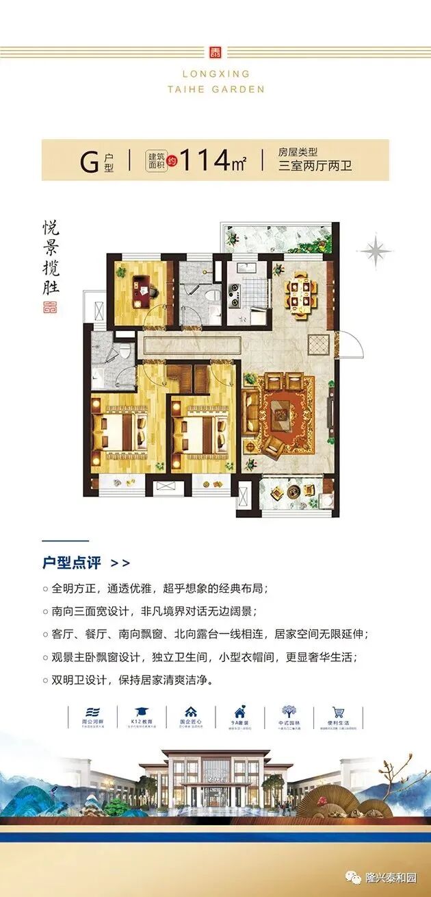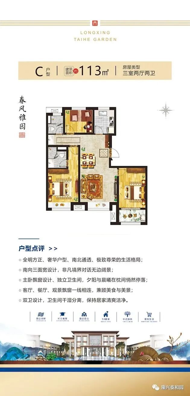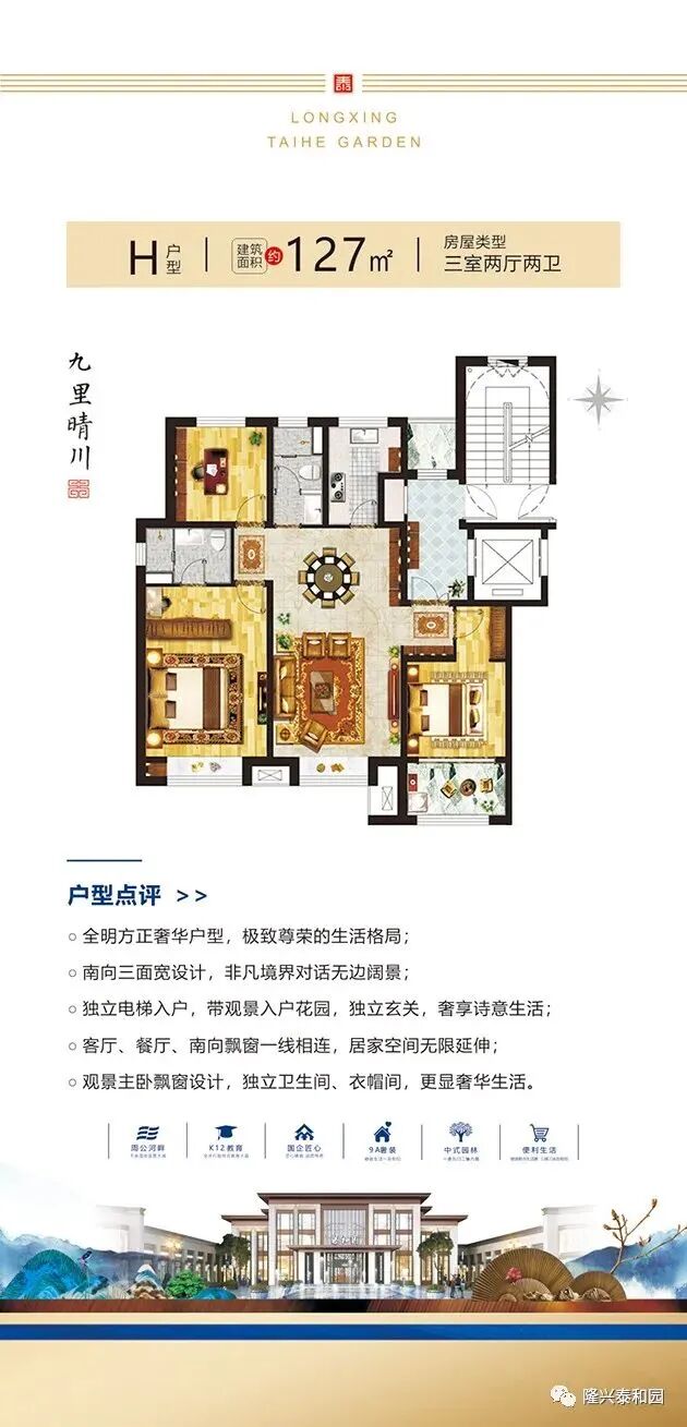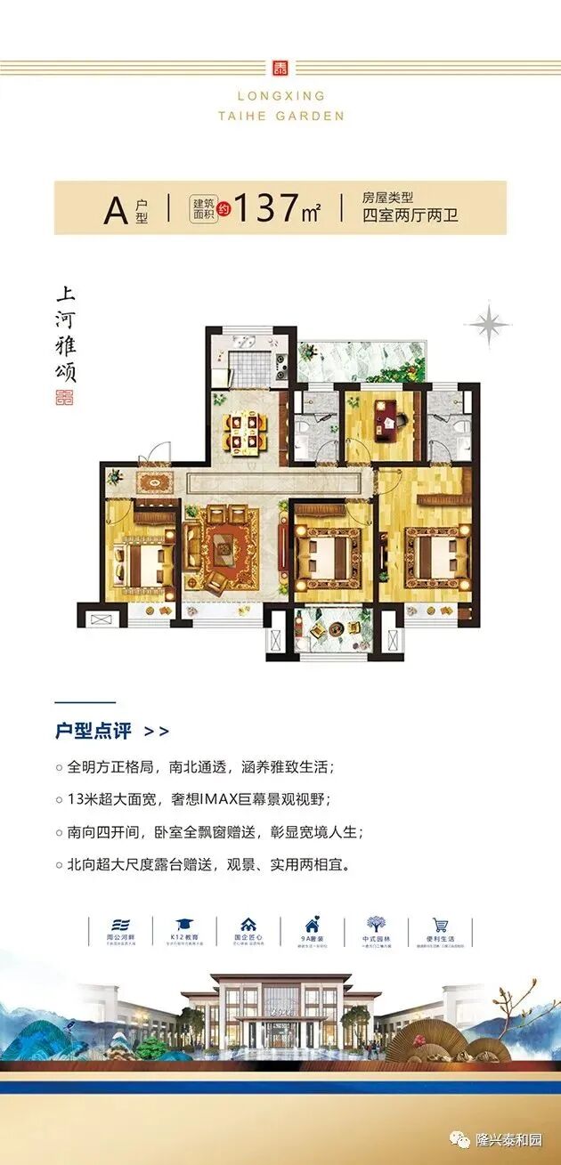 鸟瞰图 区位图 效果图 户型展示 优惠套数:509套,主要集中在2#、3#、4#、7#、8#、9#、10#、13#、14#、19#、21#、23#、27#、29#、31#、32#、35#楼 户型面积:97-218㎡ 项目电话:0635-7072666 项目地址:聊城市花园路北首周公河畔 开发公司:聊城隆兴置业有限公司 建筑类型:洋房,小高层,高层 产权年限:70年 容积率:2.2 绿化率:35% 规划户数:2216户 工程进度:在建中,竣工时间2023-12-31 楼层状况:一期东地块占地约186亩,总建筑面积约38万方,产品规划为11层花园洋房、18层中高层、26层高层住宅。 物业管理费:住宅1.5元/m²/月 物业公司:恒兴物业 车位数:2487